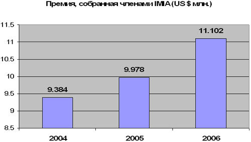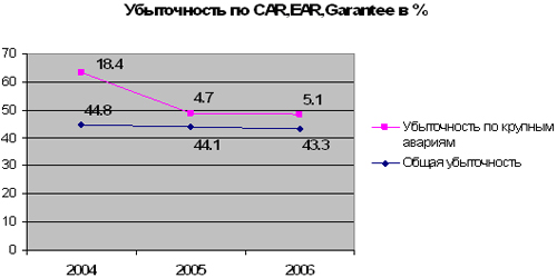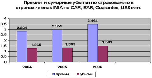 Согласно статистике IMIA премия, собранная в странах, членах этой Ассоциации по полисам CAR, EAR и G, в среднем составляет 30% по данным за 2004-2006 г.г., а ее динамика роста и суммарный размер выплаченных убытков по этим полисам представлена на рис. 3.