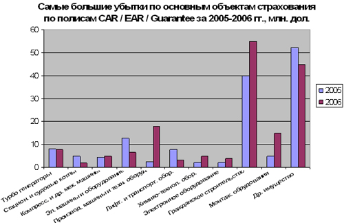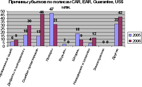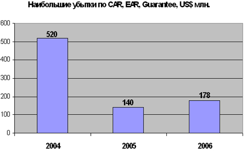 На рис. 7 представлена диаграмма распределения крупных убытков по полисам CAR / EAR/ Guarantee по данным 2005 и 2006 г.г. Как видно из рисунка наиболее крупные убытки имели место в гражданском строительстве (US$ 55 млн.) и при строительстве заводов с монтажом производственных машин и технологического оборудования (US$ 17.5 млн.). Есть над чем задуматься инвесторам и подрядчикам, реализующим подобные проекты в Украине.